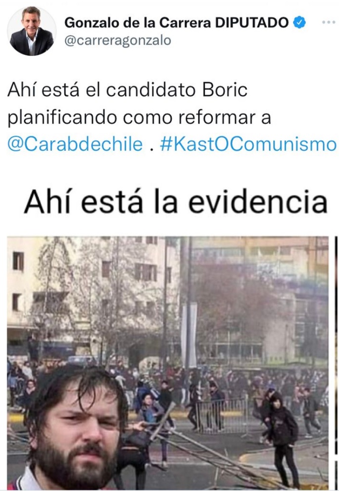 Durante el mes de diciembre del 2021, el diputado publicó en su cuenta de Twitter una imagen retocada en la cual se ve al entonces candidato presidencial Gabriel Boric tomándose una "selfie" con una protesta durante el estallido social de fondo.