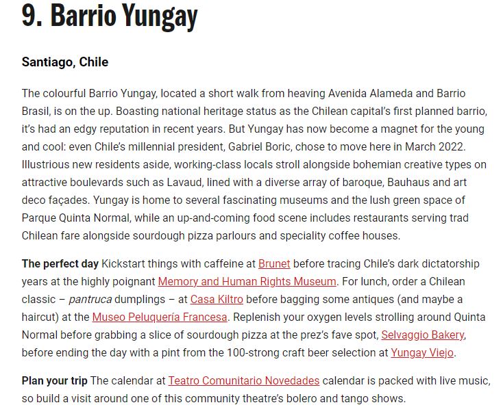 “El colorido Barrio Yungay, ubicado a pocos pasos de la animada Avenida Alameda y Barrio Brasil, está en alza. Con el estatus de patrimonio nacional como el primer barrio planificado de la capital chilena, ha tenido una reputación vanguardista en los últimos años. Pero Yungay ahora se ha convertido en un imán para los jóvenes y cool: incluso el presidente millennial de Chile, Gabriel Boric, decidió mudarse aquí en marzo de 2022”, describe el medio.