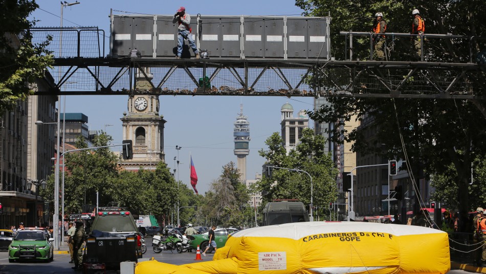 A raíz de la emergencia, efectivos del GOPE de Carabineros llegaron para desplegar un procedimiento que impida que la persona caiga y fallezca, por lo que instalaron una colchoneta gigante.