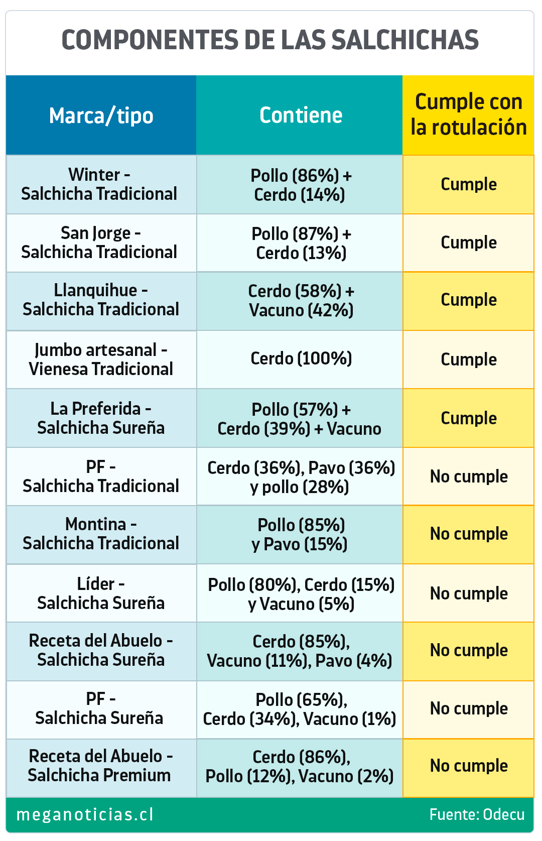 Por ejemplo, la muestra PF - Salchicha Tradicional no cumple, ya que contiene pavo, lo que no está rotulado y, además, sus ingredientes no están descritos en orden decreciente.