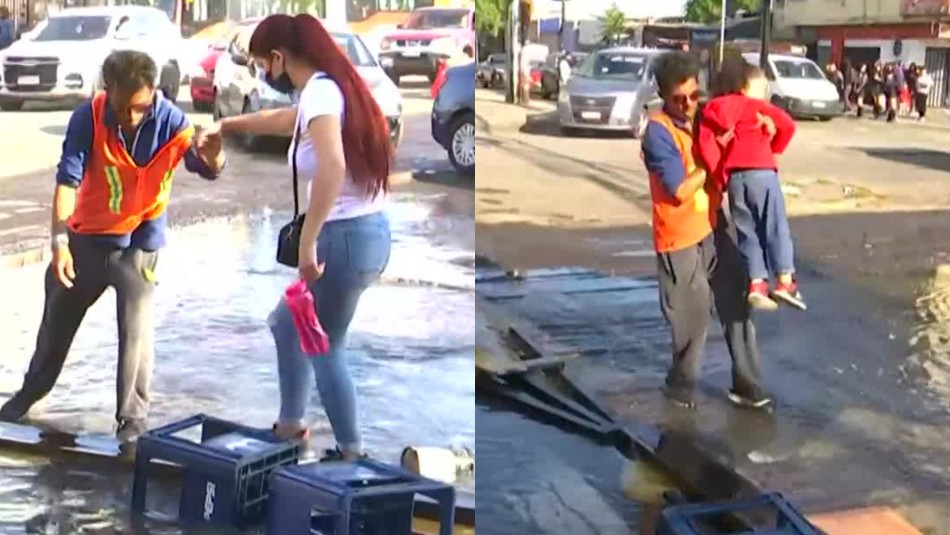 Rotura de cañería provoca inundación en Recoleta: Vecinos deben cruzar por pasarela artesanal