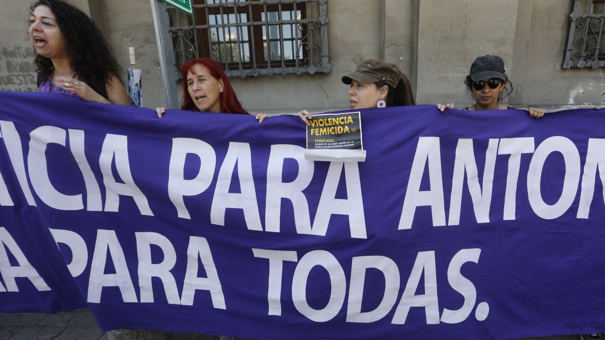 Miembros de la Coordinadora 8M realizan este jueves una manifestación en las afueras del Palacio de Tribunales, luego del fallo dado a conocer por la Corte Suprema que anuló el juicio contra Martín Pradenas.
