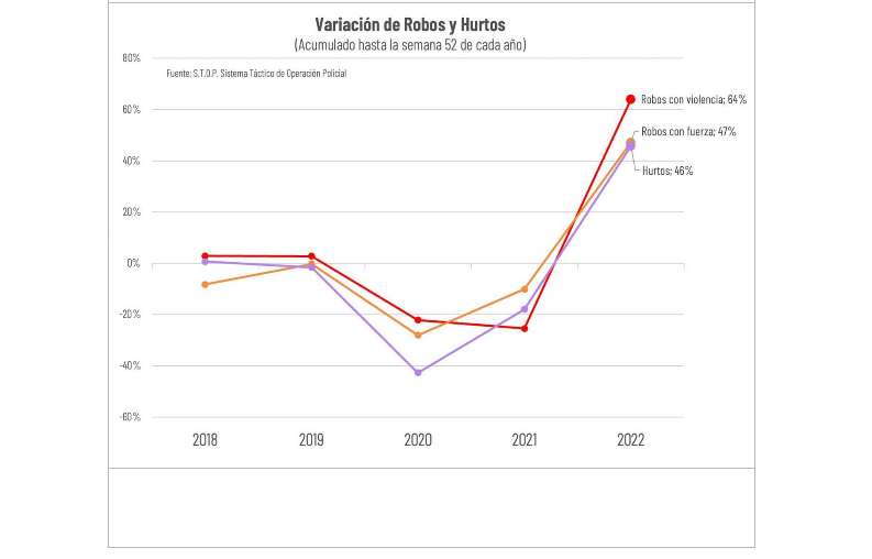 En esa misma línea, el informe demostró el aumento de diversos indiciadores oficiales que, a su vez, muestran el alza de los delitos en el año 2022. "Los robos con violencia, por ejemplo, aumentaron en un 64% en relación a 2021 de acuerdo al Sistema Táctico de Operación Policial".