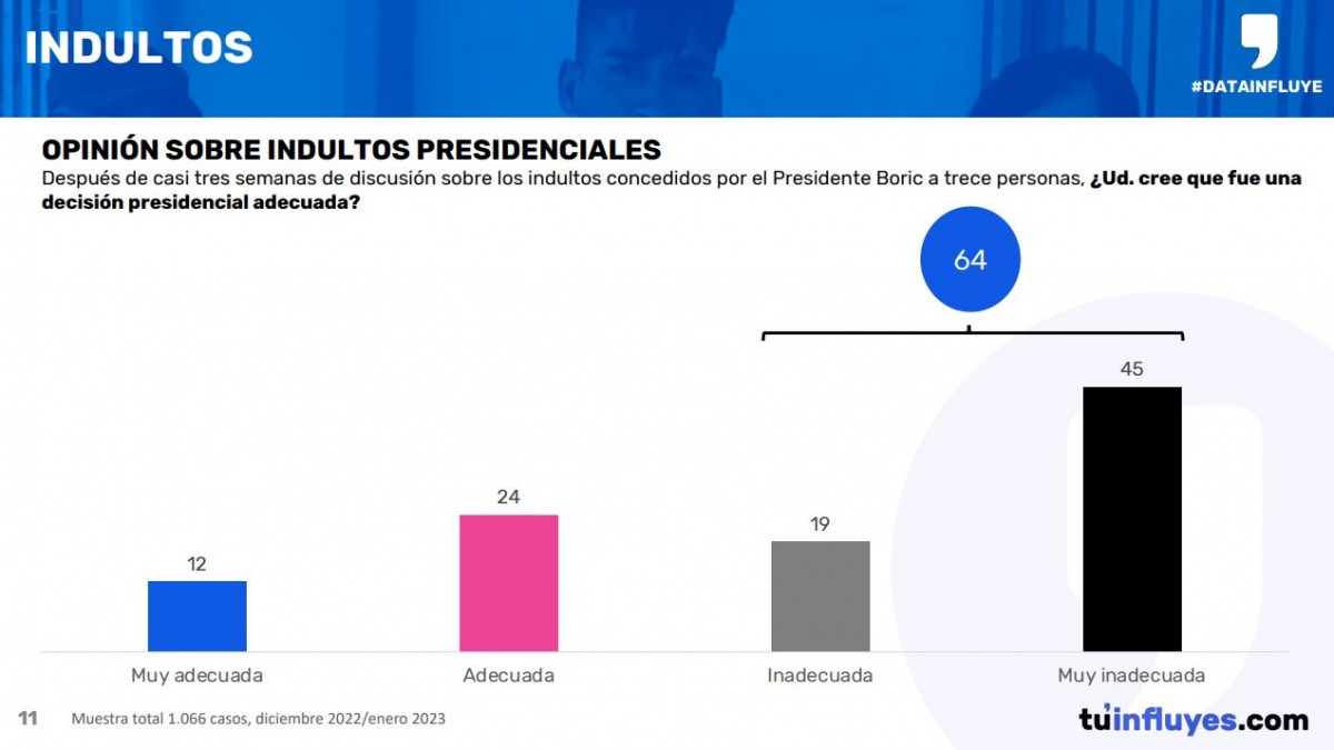 En cuanto a la decisión tomada por el Mandatario de indultar a los condenados, el 45% lo calificó como "muy inadecuada" y el 19% como "inadecuada", dando un total del 64% de rechazo.
