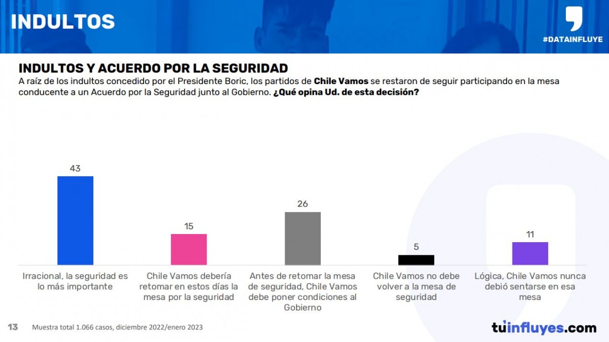 Sobre la decisión de Chile Vamos de restarse de la Mesa de Seguridad por los indultos, para el 43% fue una medida "irracional, la seguridad es lo más importante".
