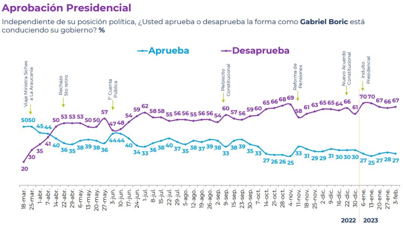 Lo anterior, exhibe que, respecto a la consulta realizada el pasado 29 de enero, se marca un aumento de un 1% en la desaprobación a la gestión del Presidente Boric, mientras que la aprobación al Mandatario descendió en un 1%.