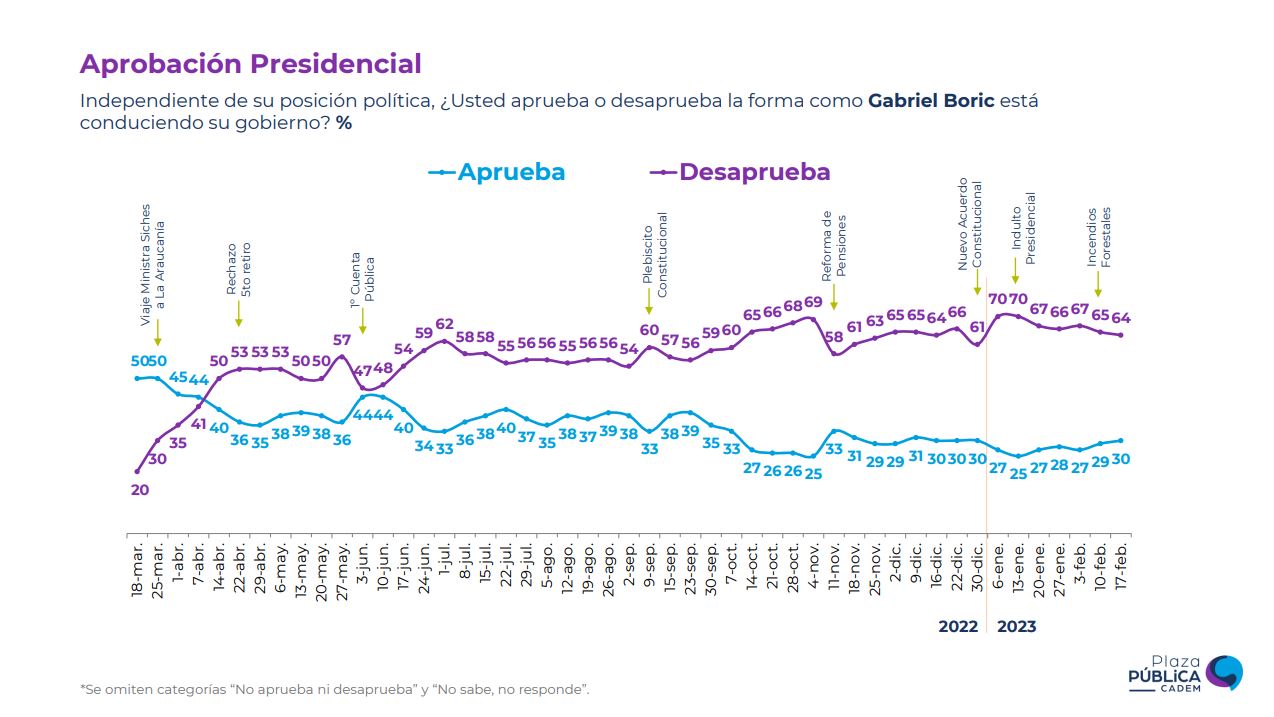 La encuesta arrojó que un 30% aprueba la forma en que el Presidente Boric está conduciendo su Gobierno, esto en el marco de la emergencia por los siniestros que aún continúan en algunas de las regiones del sur del país.