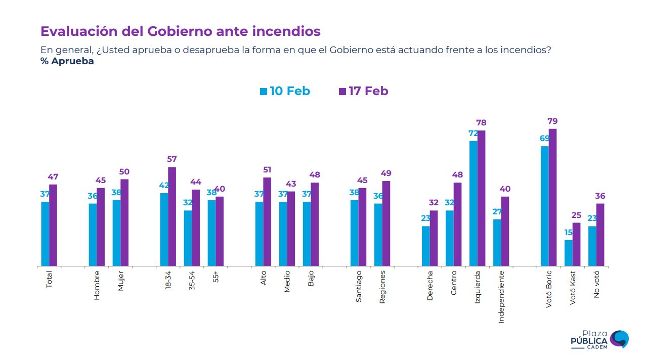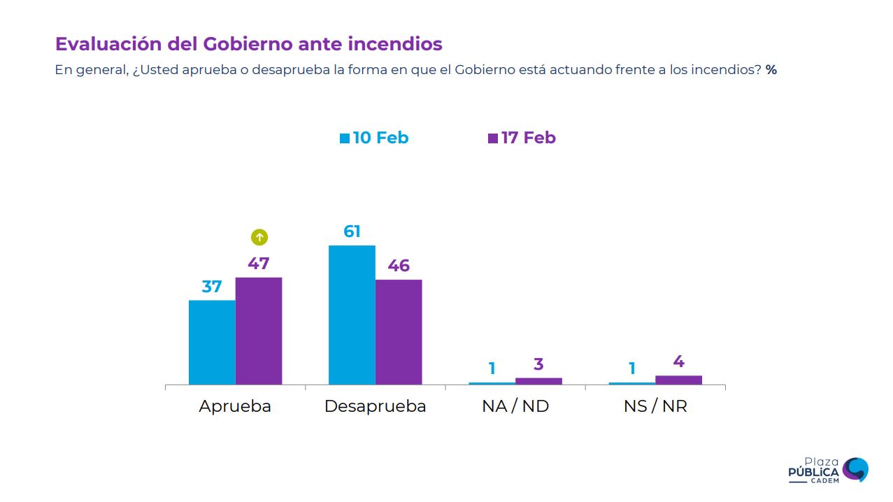 Frente a la consulta: "En general, ¿Usted aprueba o desaprueba la forma en que el Gobierno está actuando frente a los incendios?", un 47% de los encuestados contestó que la aprueba y un 46% que la desaprueba.