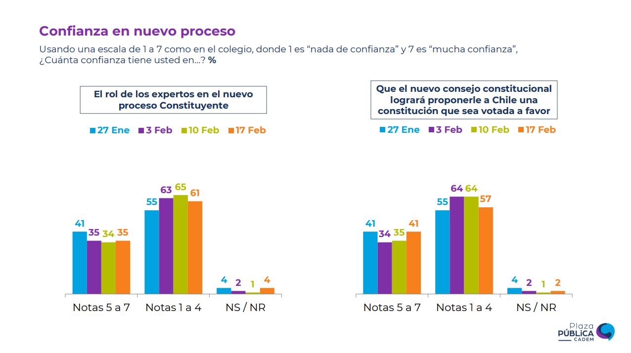 Ante el planteamiento: "Usando una escala de 1 a 7 como en el colegio, donde 1 es “nada de confianza” y 7 es “mucha confianza”, ¿Cuánta confianza tiene usted en…?", un 61% utilizó una nota entre 1 a 4 para"el rol de los expertos en el nuevo proceso Constituyente".