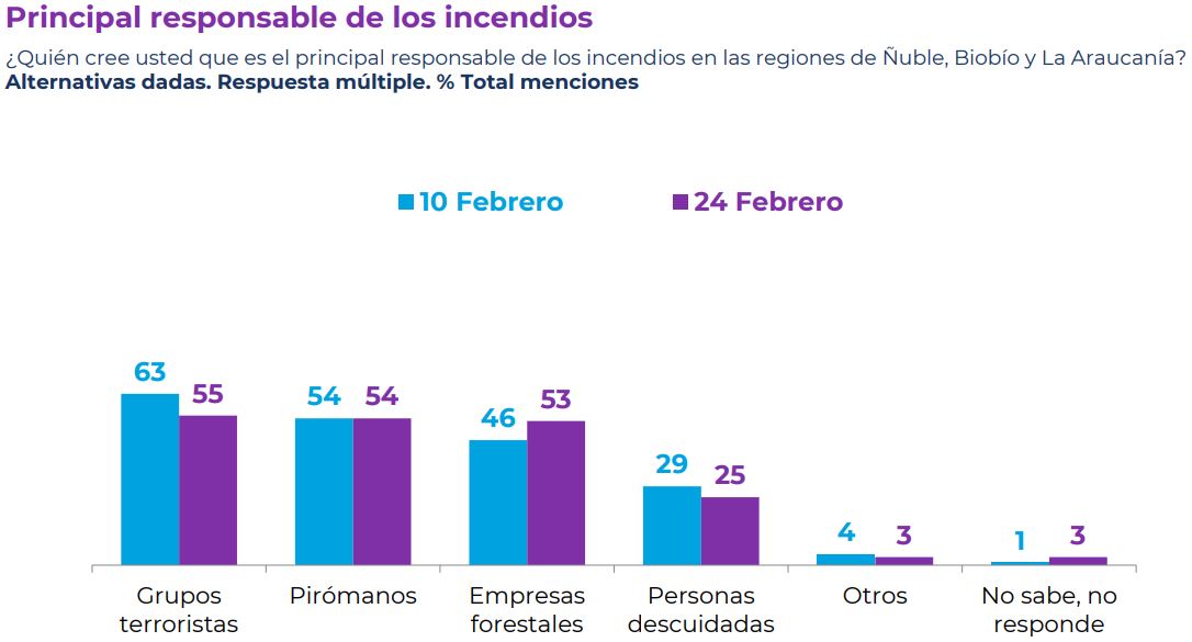 Frente a la interrogante con alternativas dadas: "¿Quién cree usted que es el principal responsable de los incendios en las regiones de Ñuble, Biobío y La Araucanía?", respecto a quién consideran el principal responsable, los encuestados respondieron de la siguiente manera: