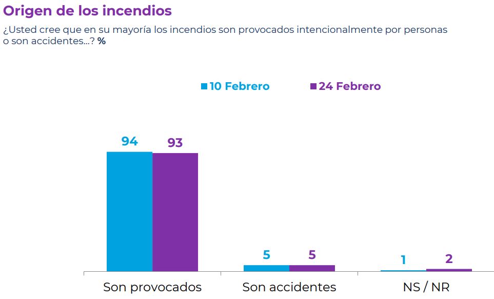 Frente a la consulta: "¿Usted cree que en su mayoría los incendios son provocados intencionalmente por personas o son accidentes...?", 93% de los encuestados respondió que estos "son provocados"; 5% que son accidentes; y 2% "no sabe / no responde".