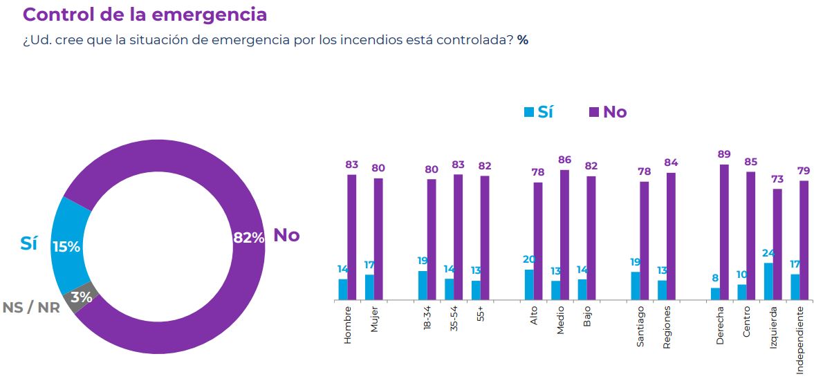 Ante la interrogante: "¿Ud. cree que la situación de emergencia por los incendios está controlada?", 15% respondió que "sí"; 82% respondió que "no"; y un 3% "no sabe / no responde".