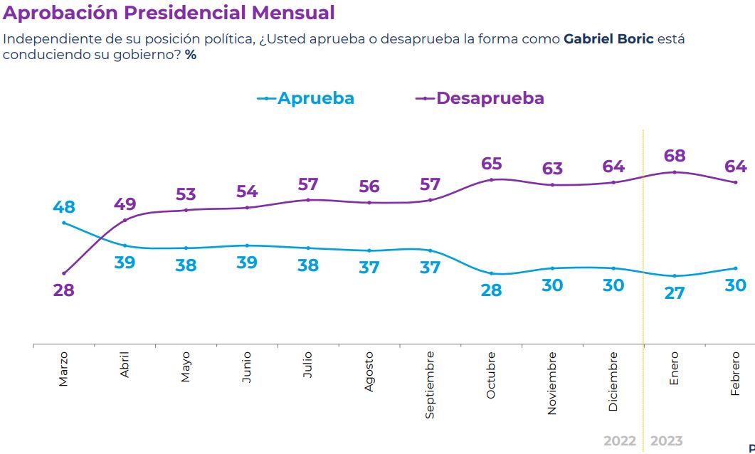 En contraparte, durante el mes de febrero la desaprobación del Presidente Boric únicamente disminuyó, pasando de un 68% de desaprobación obtenida en enero a 64% en febrero.