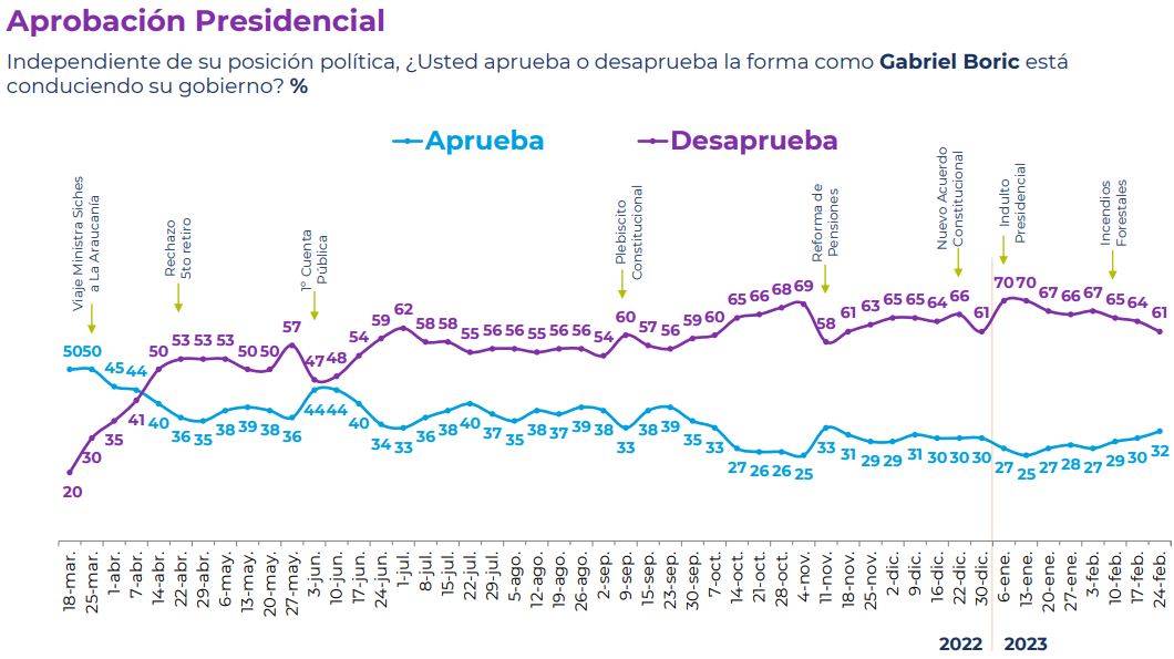 Lo anterior, respecto a la consulta realizada el pasado 19 de febrero, exhibe que se marca un aumento de un 2% en la aprobación a la gestión del Presidente Boric, mientras que la desaprobación al Mandatario descendió en un 3%.
