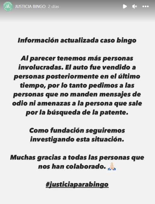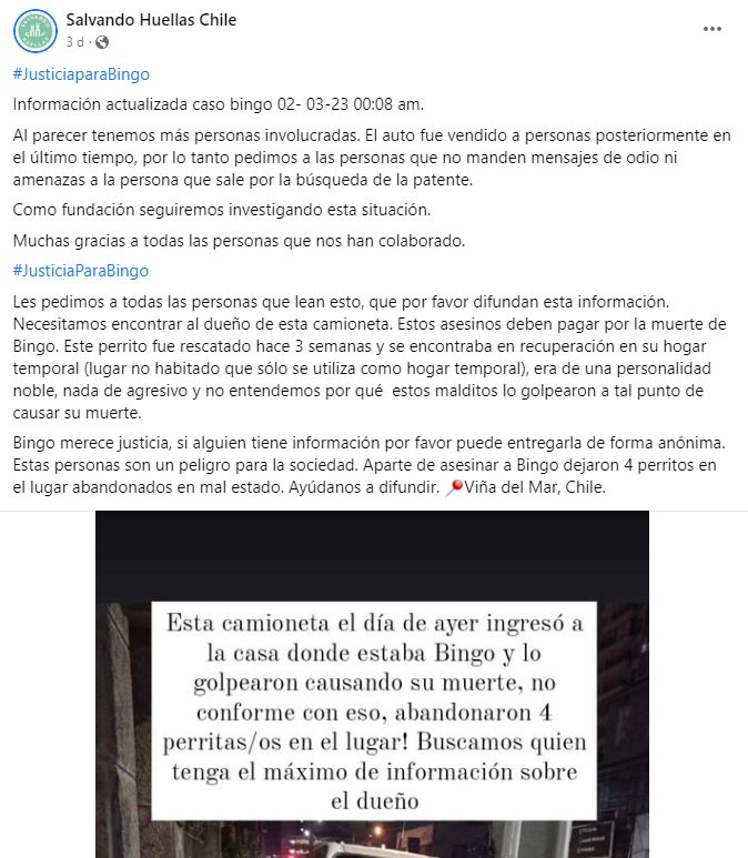 Según contó la propia fundación que rescató al animal, Salvando Huellas, a través de sus redes sociales, Bingo se encontraba en un hogar temporal, al cual llegaron dos hombres y una mujer, quienes, sin motivo aparente, le quitaron la vida a palos.