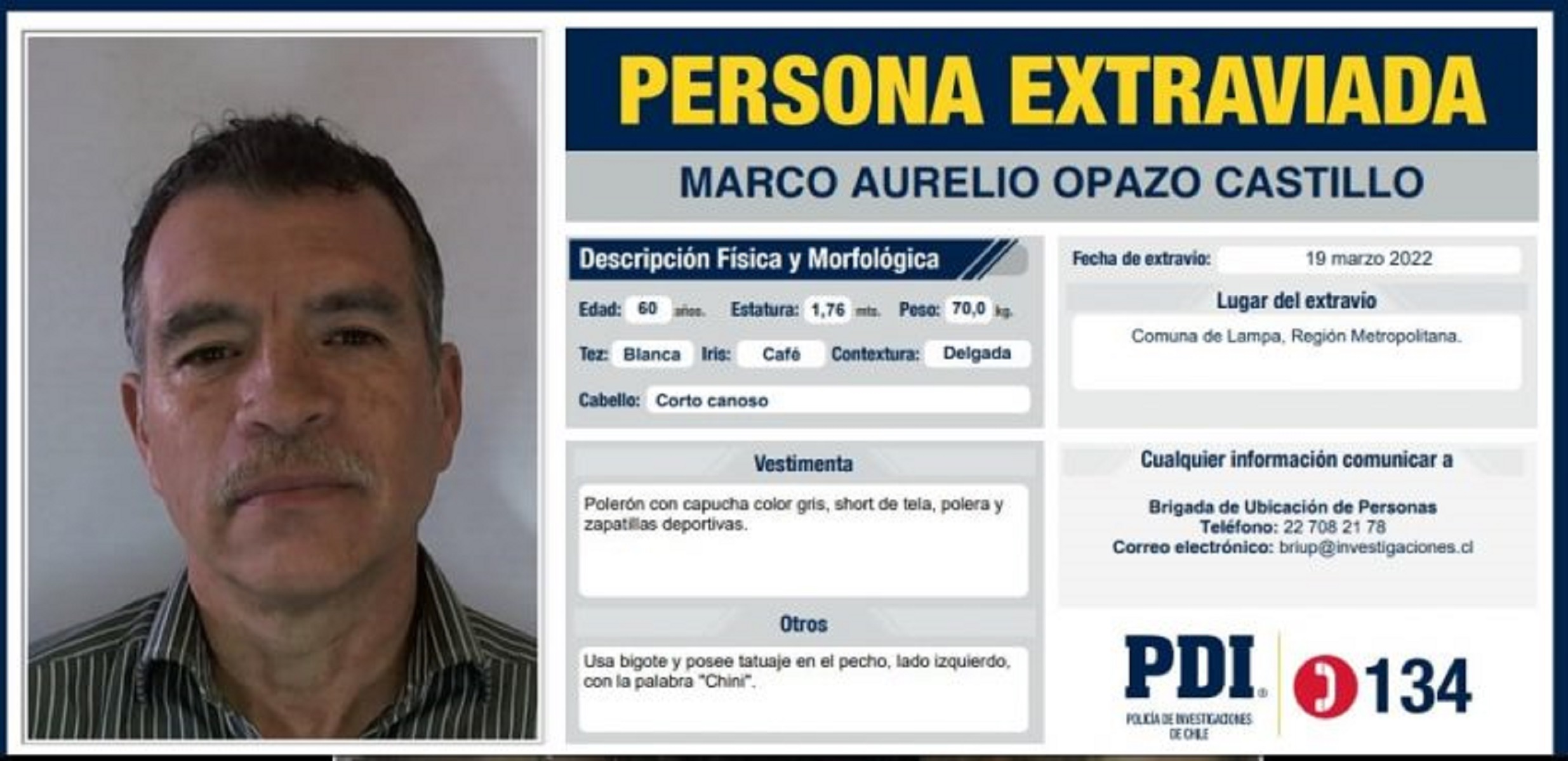 Después de desayunar con su pareja, en su domicilio ubicado en la comuna de Lampa, región Metropolitana, cerca de las 11 horas salió de su hogar y nunca más regresó.