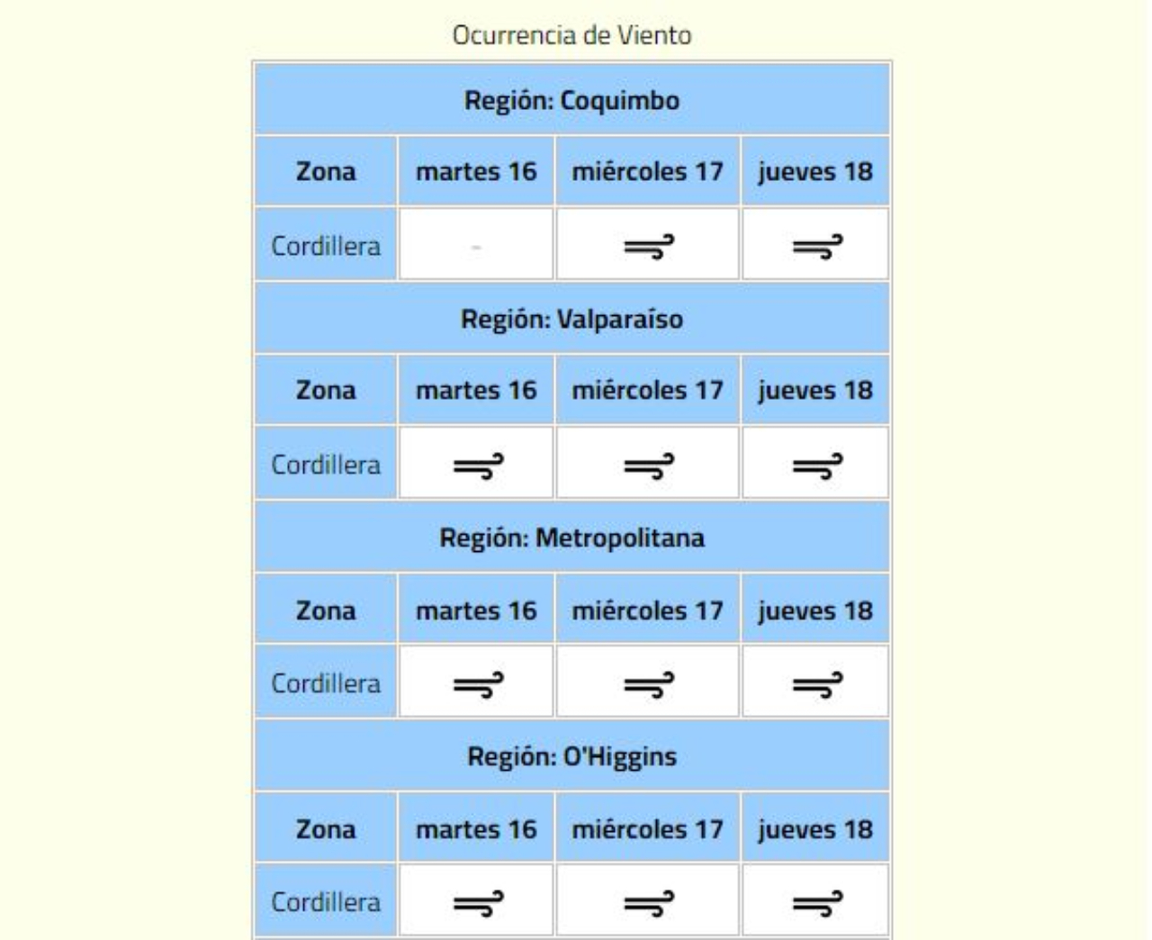 El organismo anunció, a través de su cuenta de Twitter oficial, la presencia de "viento normal a moderado en zonas desde la región de Coquimbo a la región de Ñuble".
