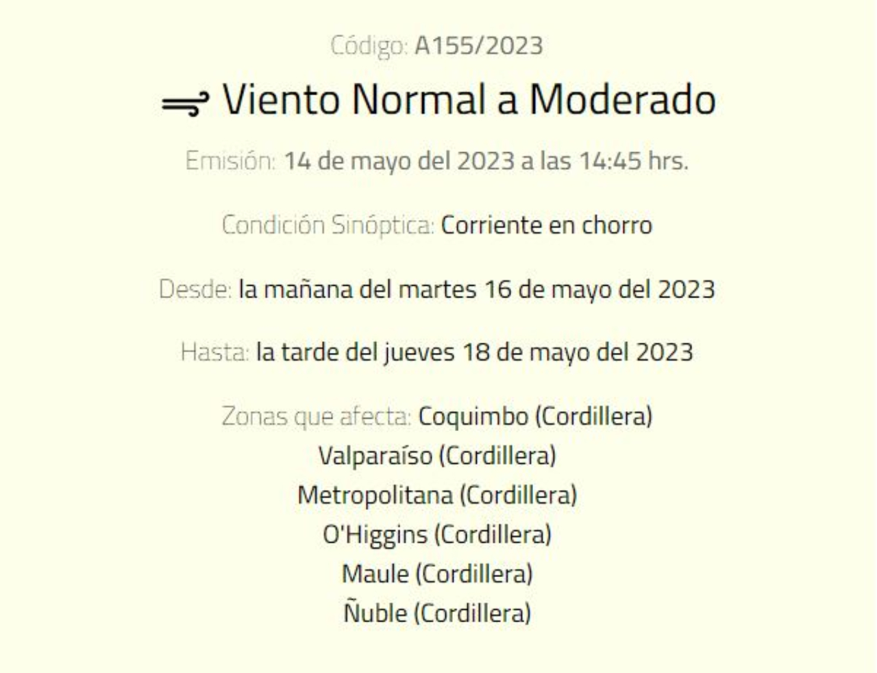 #Aviso A155/2023: [14/may 14:50] Viento Normal a Moderado en zonas desde la región de Coquimbo a la región de Ñuble https://t.co/NyETYTqaZ2 pic.twitter.com/IIXS1ib68x