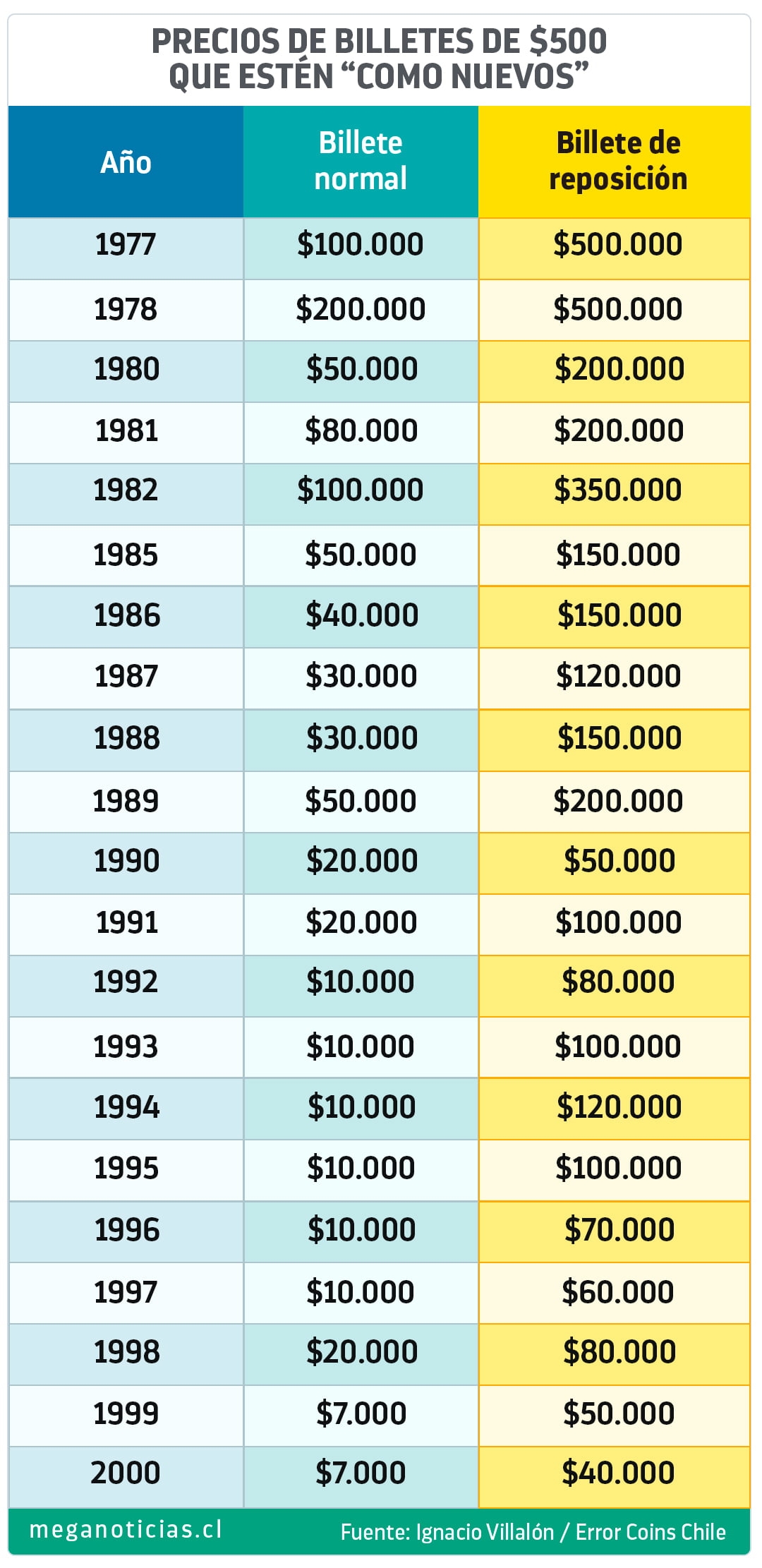 El coleccionista Ignacio Villalón, que está tras la cuenta de Instagram y TikTok "Error Coins Chile", explicó que hay billetes de $500 que se pueden vender hasta en $500.000, dependiendo de factores como su año de emisión y estado en que se encuentre.