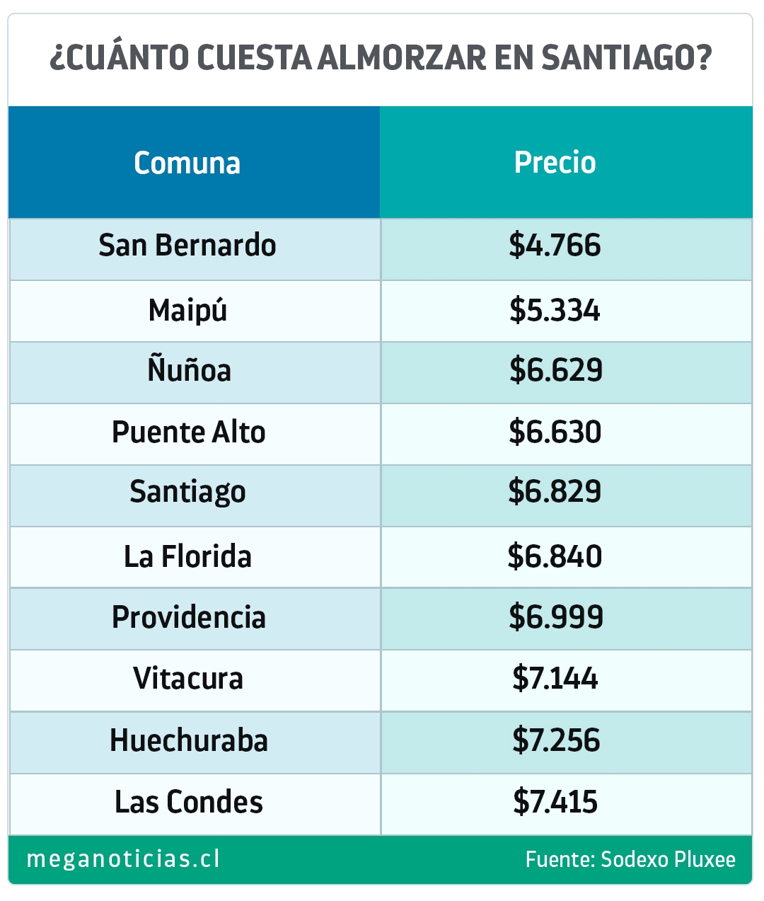 Para la comparación se consideraron diez comunas de la Región Metropolitana, obteniendo un precio promedio por cada una de ellas. En detalle, los valores de los menús en Santiago son: