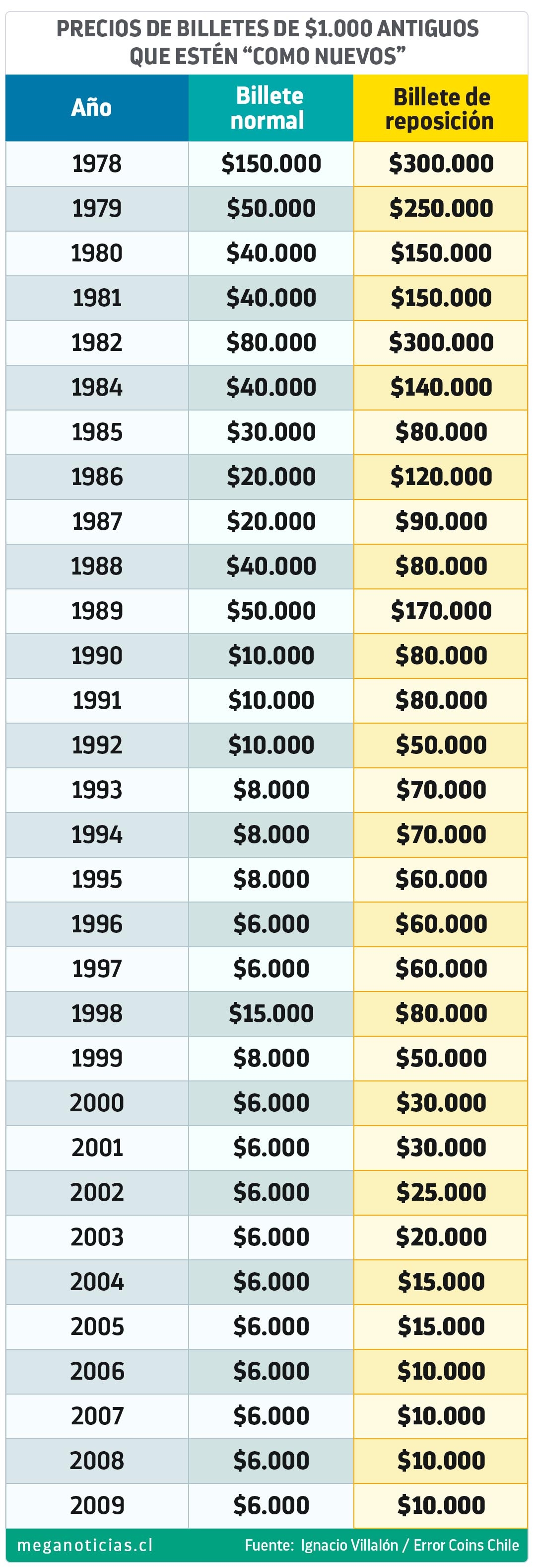El numismático entregó, a este medio, un listado de los precios que puede alcanzar un billete de $1.000 antiguos que esté 'sin circular', es decir, como nuevo, y cuyo valor dependerá de su año de emisión y de si corresponde a un ejemplar normal o de reposición.