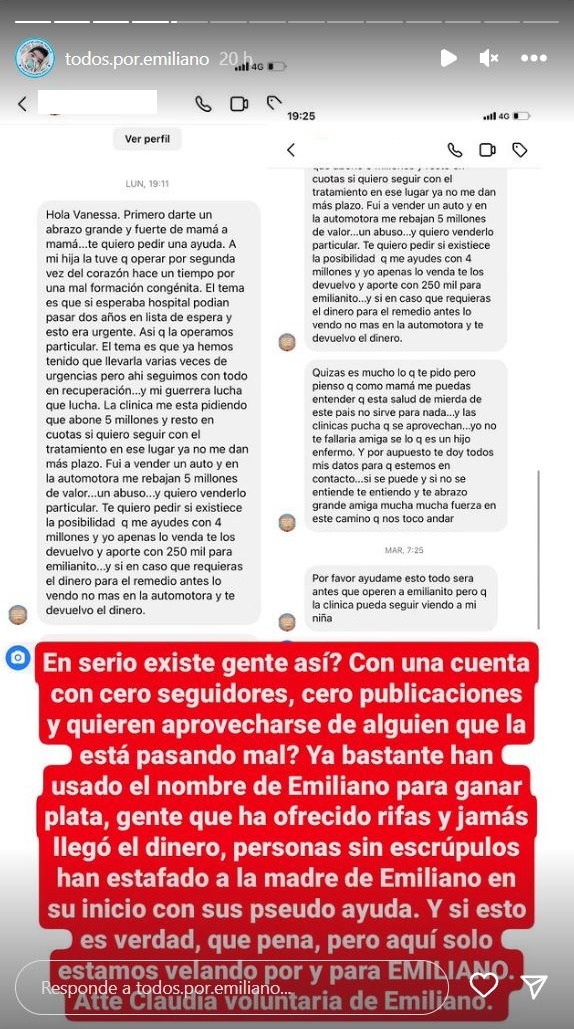 Lo que sería una petición de ayuda, provocó que Claudia, una de las voluntarias de "Todos por Emiliano", cuestionara la veracidad del mensaje y acusara que el nombre del niño se ha usado para recaudaciones que nunca llegaron a ellos.