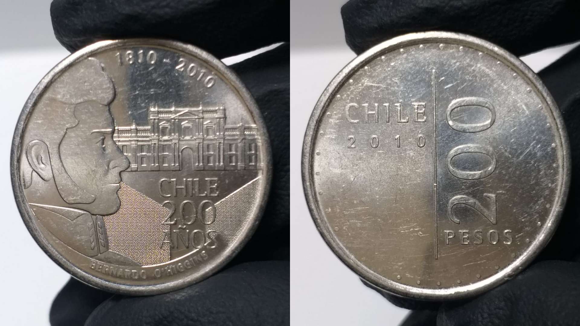 La moneda, de tonalidad plateada, cuenta con la imagen de Bernardo O'Higgins y del Palacio de La Moneda en su reverso, además de los textos "1810-2010" y "Chile 200 años". En el anverso aparece el valor de 200 pesos y la leyenda "Chile 2010".