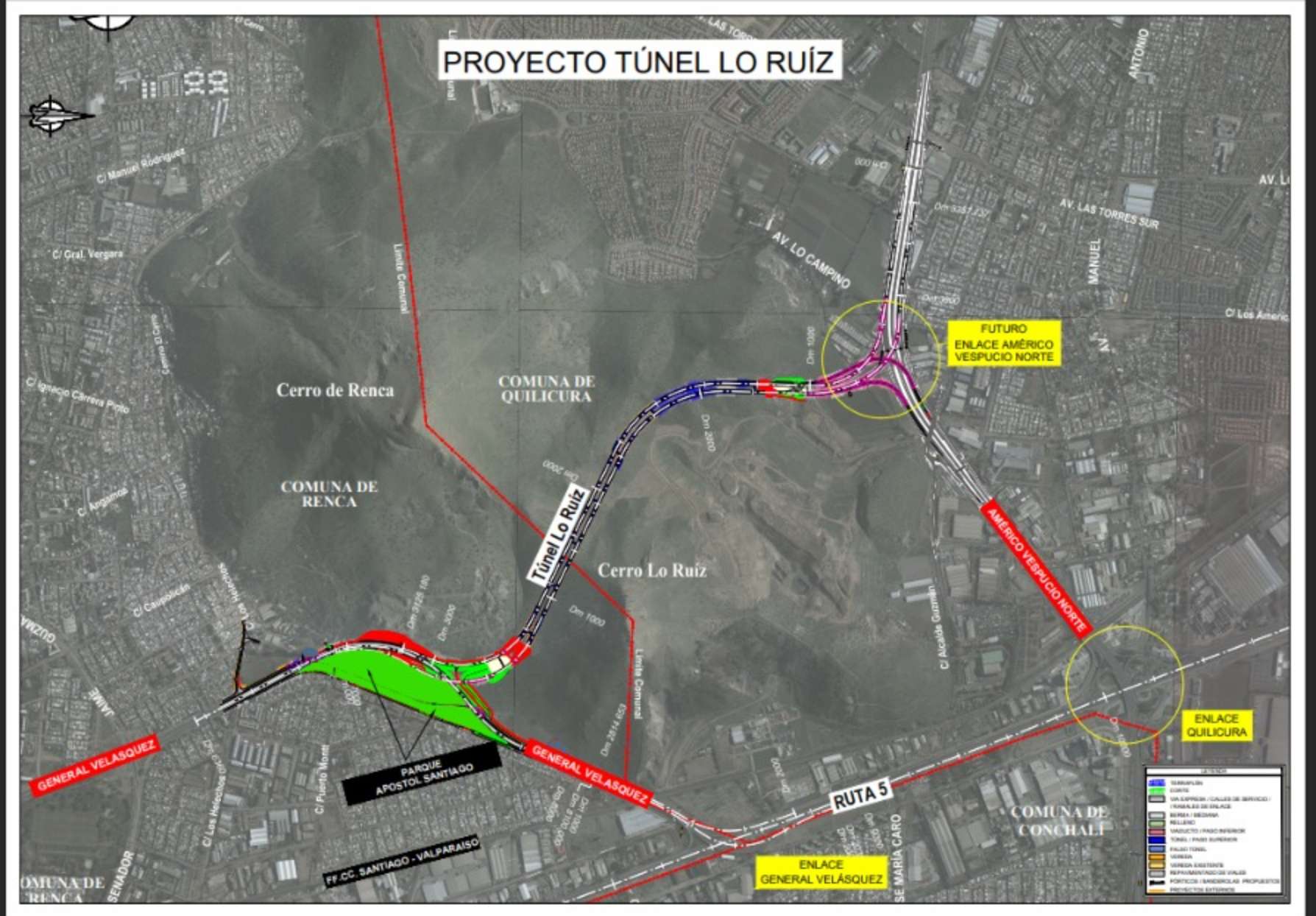 Se trata de una inversión de 450 millones de dólares que contempla 5,8 kilómetros en conexiones. Lo principal será dos túneles de 1,5 kilómetros de extensión bajo el cerro Lo Ruiz con dos pistas por sentido, los que conectarán el eje de la autopista General Velásquez con la autopista Américo Vespucio Norte. Además, se incluirán tramos para unir el eje General Velásquez de la Autopista Central con Vespucio Norte en ambas direcciones.