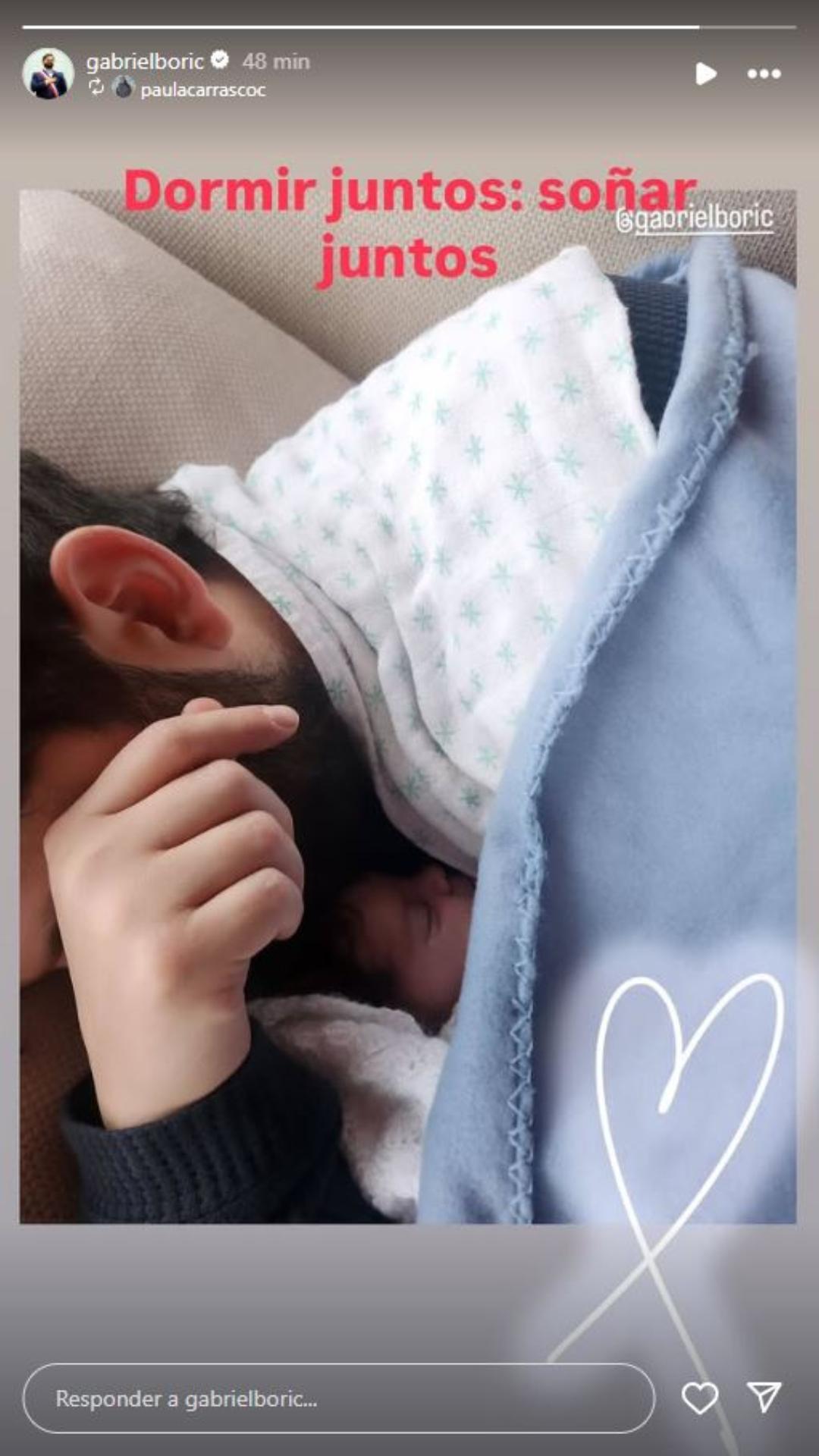 El Presidente Gabriel Boric y su pareja, Paula Carrasco, compartieron en sus redes sociales un nuevo registro de su hija Violeta. La fotografía, publicada en primera instancia por la deportista y luego reposteada por el mandatario, muestra a la bebé durmiendo en brazos de su padre.