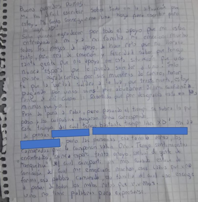 "Tengo sentimientos encontrados nunca espere tanto apoyo, incluso de gente de 'Manquehue', del cual compartí un mes cuando estuve en comisión, del cual me emocioné mucho, esos lazos que uno forma, esa palabra camarada, esa familia que uno escoge a pesar de todos los malos ratos que vivimos. Uno no tiene palabra para expresarse", añadió.