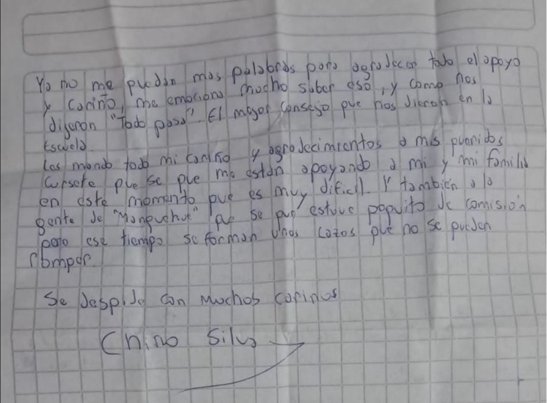 Finalmente, manifestó: "les mando todo mi cariño y agradecimiento a mis queridos cursete que sé que me están apoyando a mí y mi familia en este momento, pues es muy difícil. Y también a la gente de 'Manquehue' que sé que estuve poquito de comisión, pero en ese tiempo se forman unos lazos que no se pueden romper".