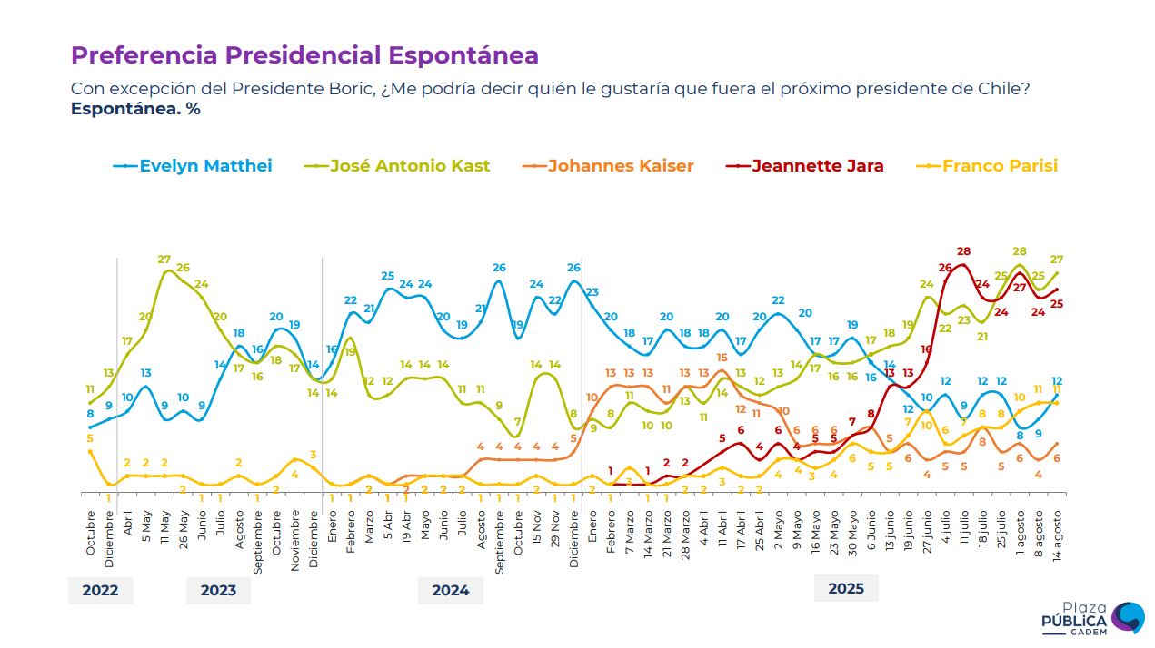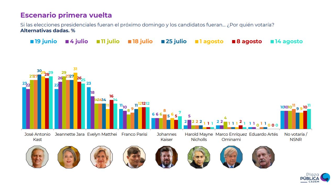 El candidato del partido republicano, José Antonio Kast, se mantiene como favorito en la pregunta "¿Me podría decir quién le gustaría que fuera el próximo presidente de Chile?", según la nueva publicación de la encuesta Cadem, correspondiente a hoy domingo 17 de agosto.