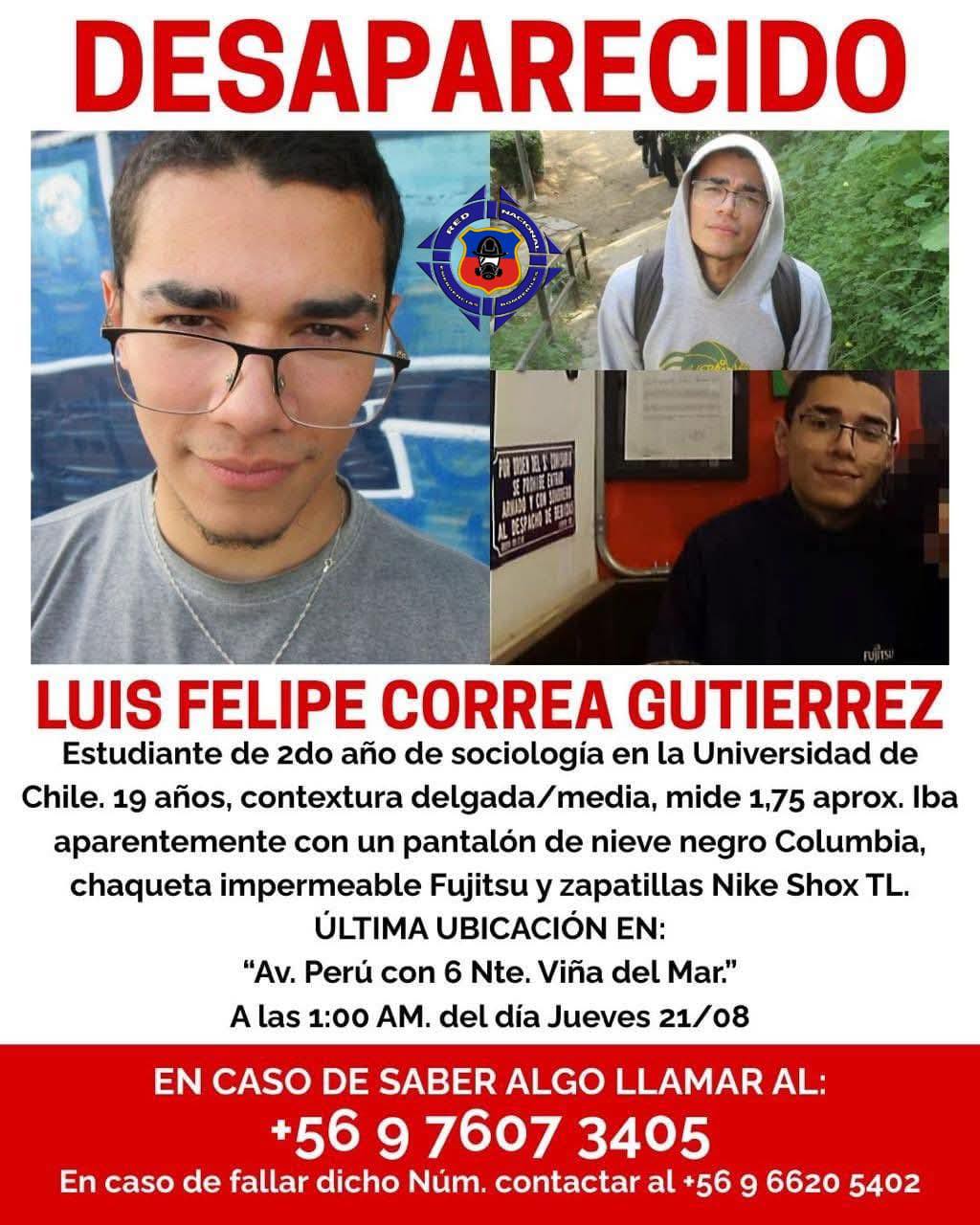 Este martes se cumplen cinco días desde la desaparición de Luis Felipe Correa Gutiérrez, estudiante universitario de 19 años que vive en San Bernardo, pero cuyo último rastro se registró en la comuna de Viña del Mar, región de Valparaíso.