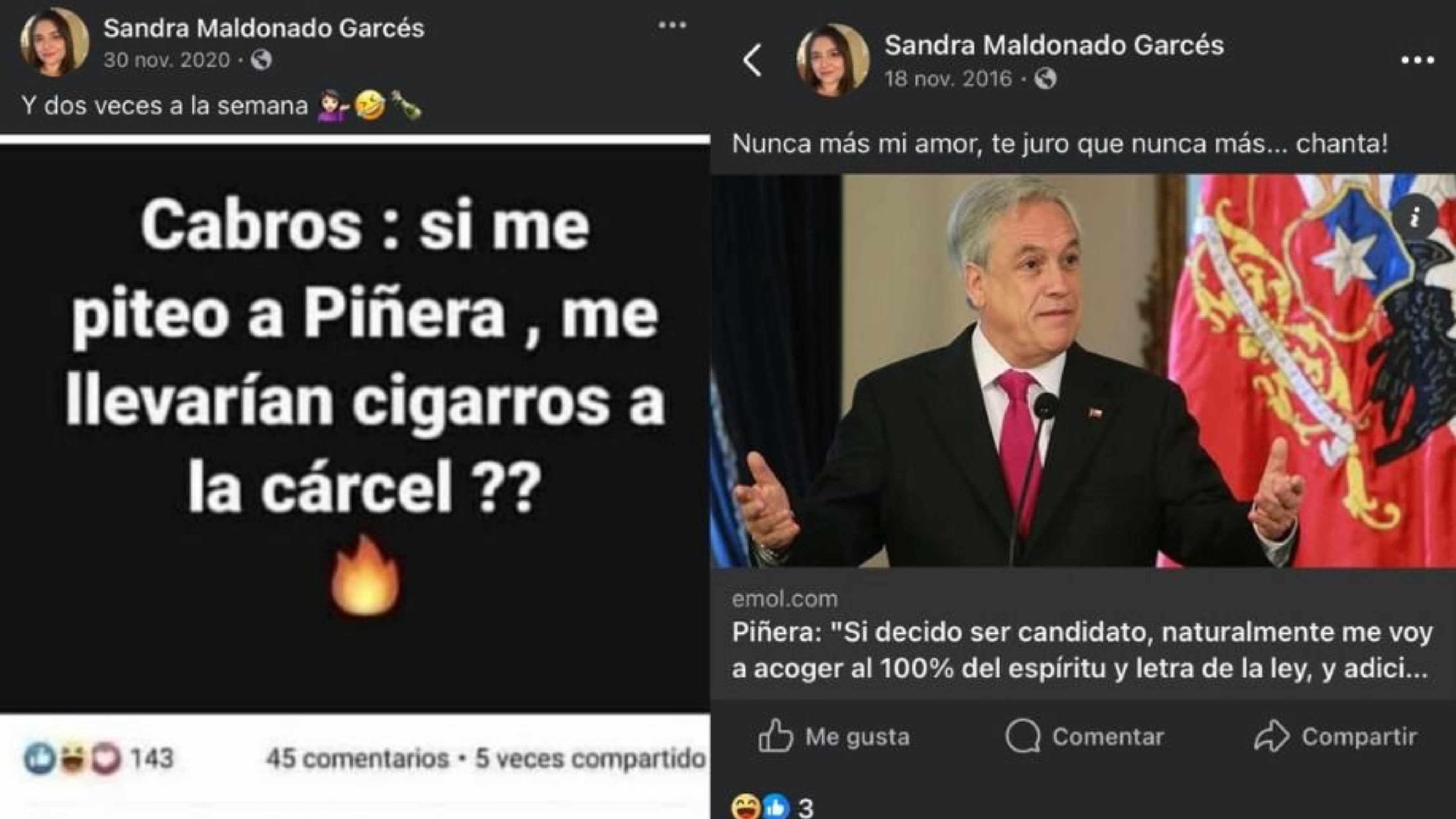 Las publicaciones de Maldonado en contra del fallecido exmandantario se viralizaron en las últimas horas. En una de ellas, que data de noviembre de 2020, compartió una imagen que decía "cabros: si me piteo a Piñera, me llevarían cigarros a la cárcel??", agregando como comentario: "Y dos veces a la semana".