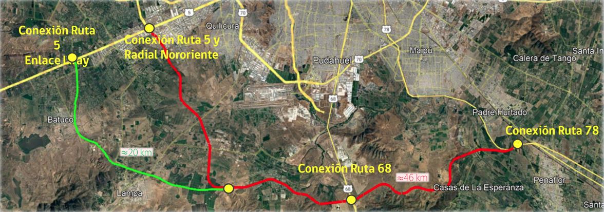 La ruta principal -de 46 km- iniciará en el enlace de la Ruta 5 Norte con la Autopista Radial Nororiente, en Colina, continuando su recorrido por Lampa, Pudahuel, Maipú, Padre Hurtado y Peñaflor, en donde se conectará con la Ruta 78 y la Autopista Orbital Sur.