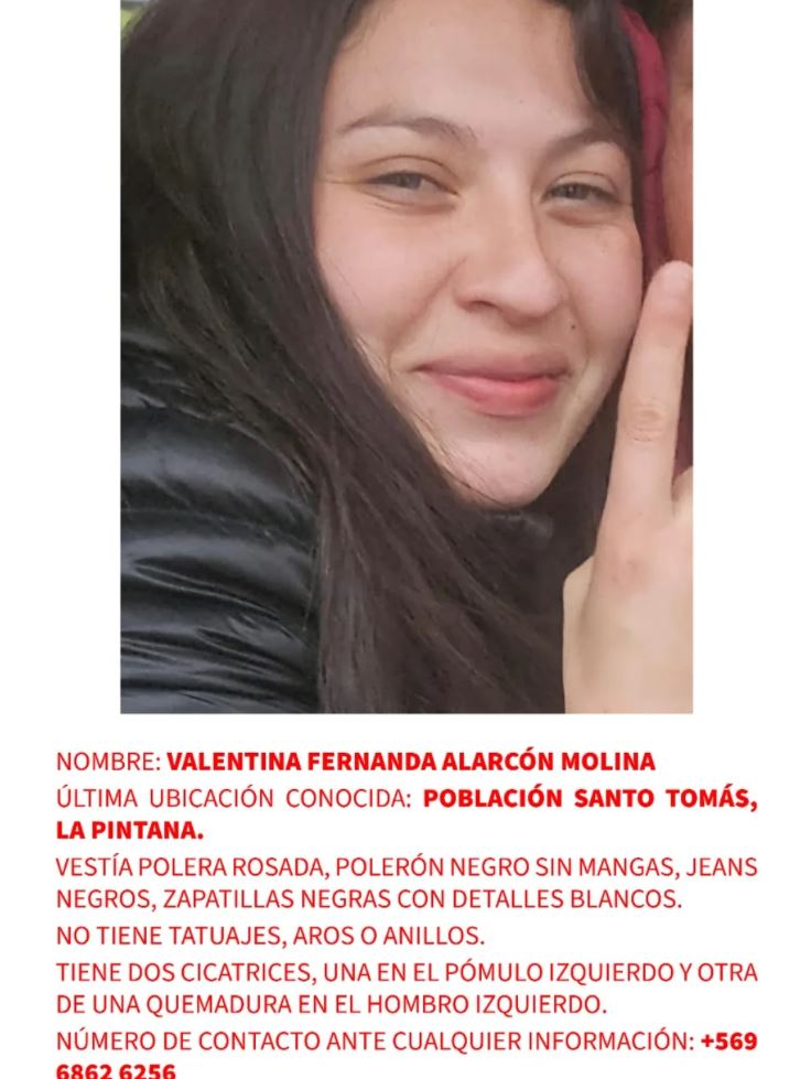 El pasado sábado desapareció Valentina Fernanda Alarcón Molina, joven de 26 años cuyo rastro se perdió tras presuntamente asistir a un evento de barristas en la población Santo Tomás de La Pintana, en la Región Metropolitana.