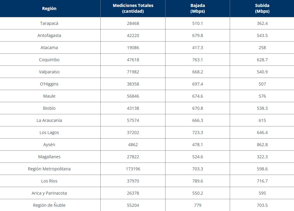 En tanto, las regiones con velocidades de subida más altas son Aysén (862,8 Mbps), Los Ríos (716,7 Mbps) y Ñuble (703,5 Mbps).