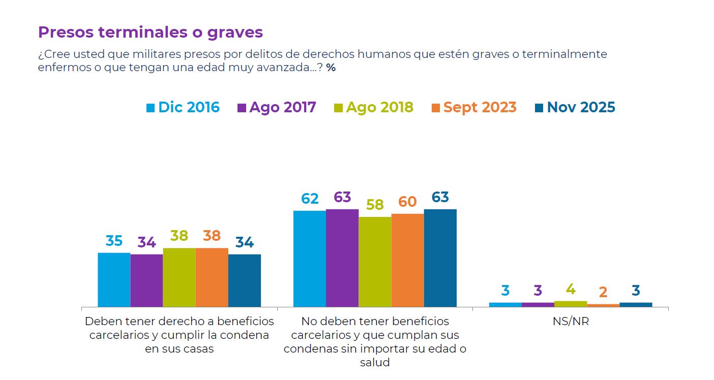 Por otro lado, la encuesta consultó: "¿Cree usted que militares presos por delitos de derechos humanos que estén graves o terminalmente enfermos o que tengan una edad muy avanzada...?