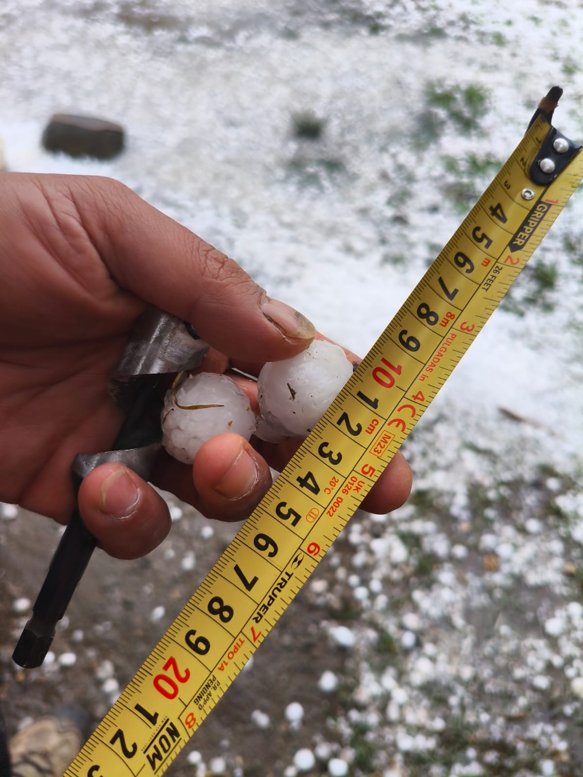 Ir a la siguiente notaVarios miembros de la comunidad Megatiempo enviaron fotografías del fenómeno y al medir los granizos se puede ver que alcanzan un tamaño de entre 1,5 y 2 centímetros de diámetro.