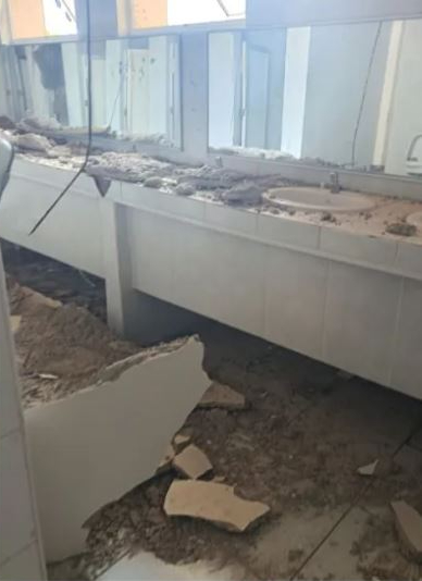 Ir a la siguiente notaEn las imágenes publicadas por el mismo medio se puede ver una gran cantidad de material sólido que se desprendió desde el cielo raso de la techumbre, cayendo sobre los lavamanos, el pasillo y los cubículos del sanitario.