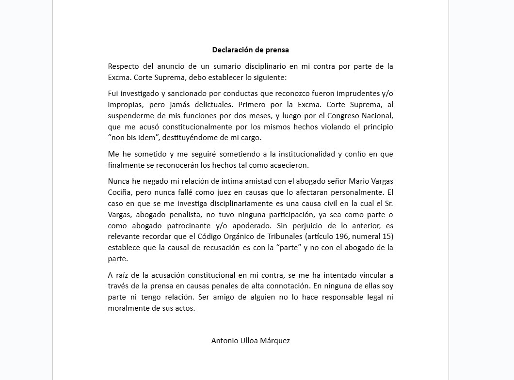 Desde el Poder Judicial explicaron a MegaInvestiga que la destitución de Ulloa no implica que no se pueda iniciar una investigación disciplinaria, ya que la responsabilidad administrativa no se extingue con el cese de funciones.