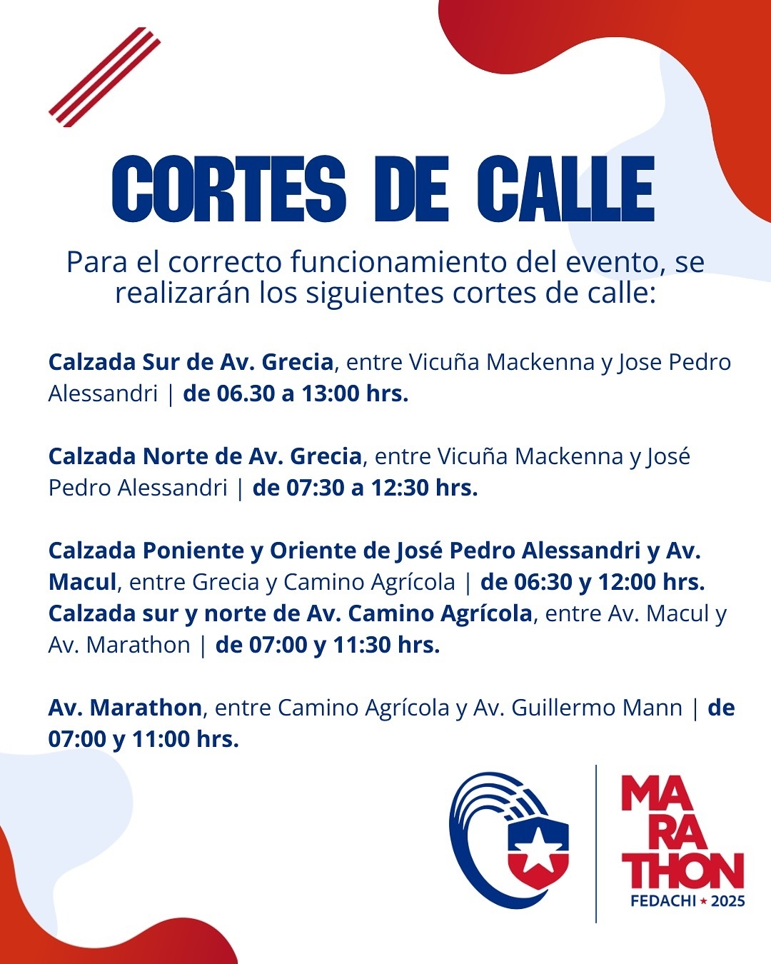 A raíz del evento deportivo, se implementarán algunos cortes de calle en Santiago. De acuerdo con el informe de la Dirección de Tránsito, las principales vías afectadas serán Av. Pedro de Valdivia, Av. Grecia, Av. José Pedro Alessandri/Av. Macul, Av. Marathon y Guillermo Mann.