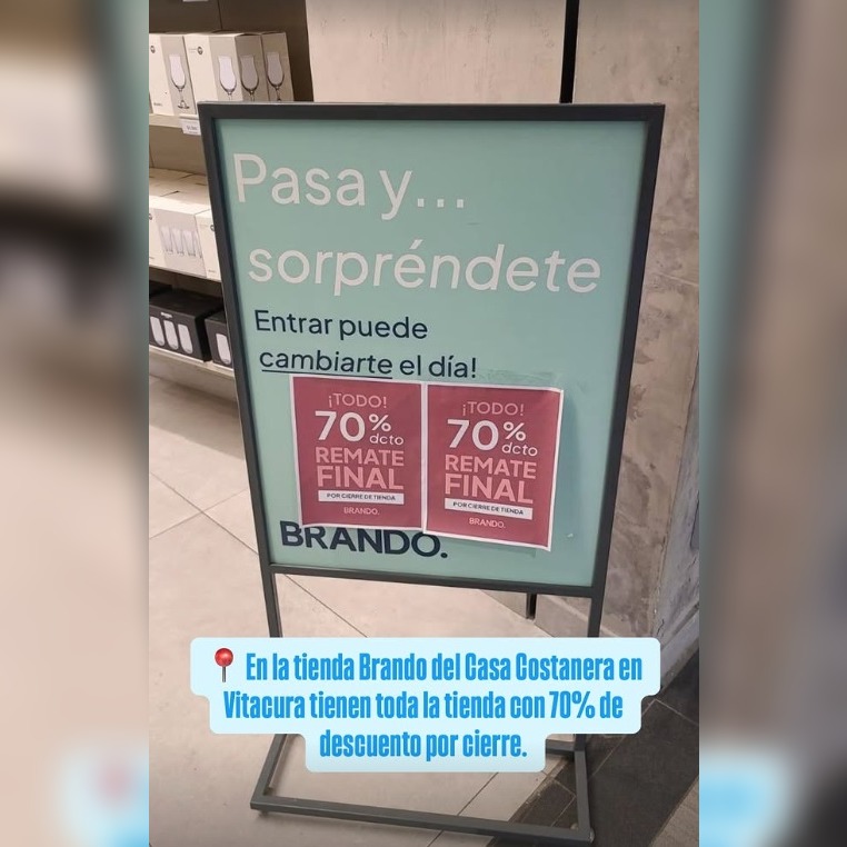 En los próximos días se sumará al listado el local emplazado en Casacostanera, el mall de Vitacura, que reúne comercios de las categorías vestuario y calzado, accesorios, hogar, deporte, salud y belleza, entre otras. Según reportes de usuarios, en su entrada hay un afiche que promociona el remate final de 70% de descuento en toda la tienda por cierre.