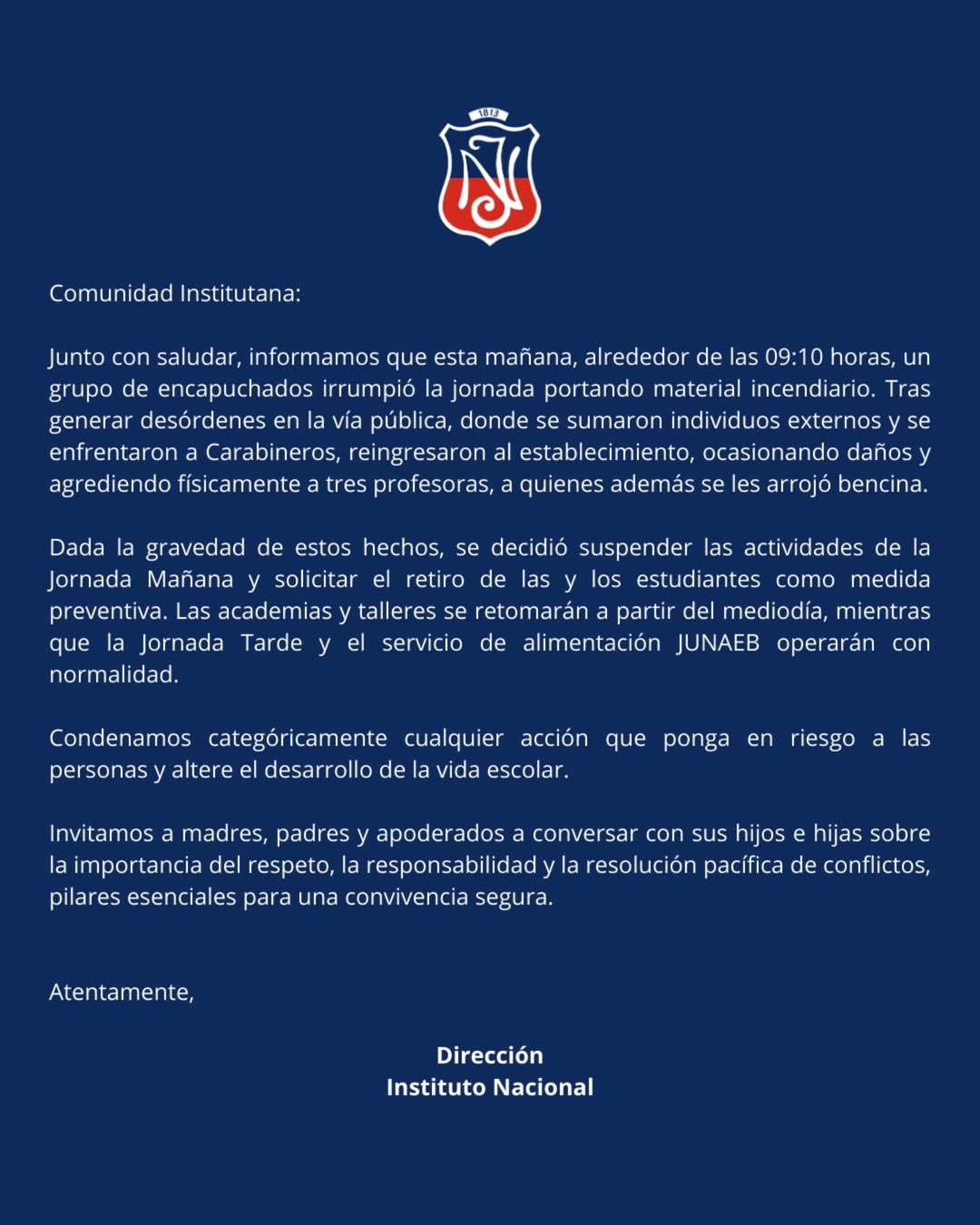 Además, el Instituto Nacional indicó que "dada la gravedad de estos hechos, se decidió suspender las actividades de la Jornada Mañana y solicitar el retiro de las y los estudiantes como medida preventiva".