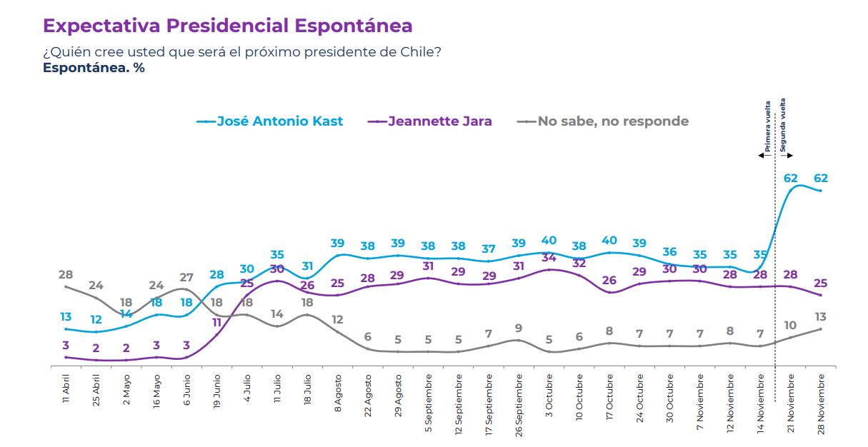 En dicho apartado, el candidato del Partido Republicano y de la oposición se alza con un 62%, mientras que Jeannette Jara (PC y del pacto oficialista) obtuvo un 25%, cifra que significó una reducción de 3% frente a las semanas anteriores, cuando Jara rondó el 28% de las menciones espontáneas.
