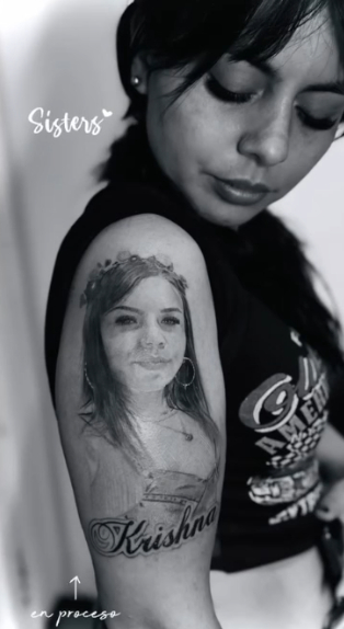La joven compartió la primera sesión del diseño realista del rostro de Krishna, un trabajo que cubre gran parte de su brazo y que, según explicó, aún está en proceso.