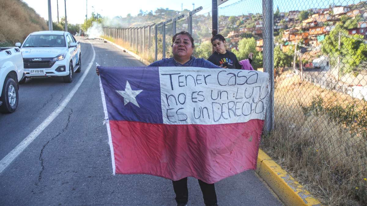 La mujer, llamada Natalia Ortiz, apareció sosteniendo una bandera chilena con un mensaje que decía, "tener casa no es un lujo, es un derecho".