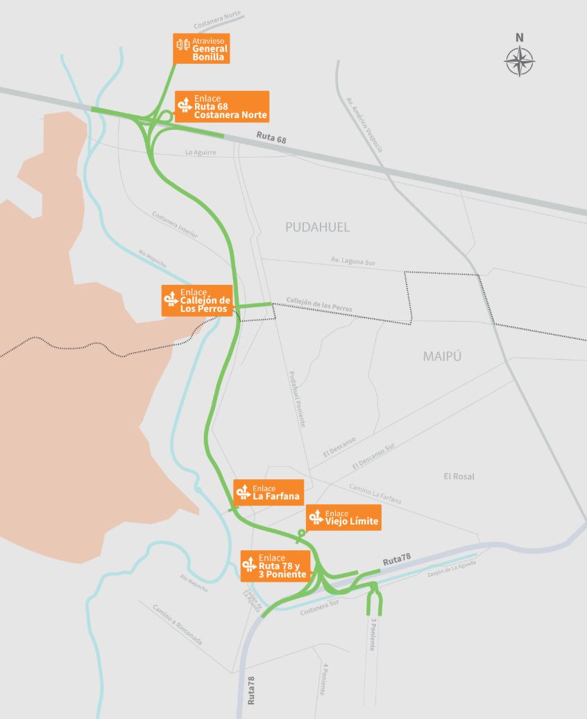 El trazado tendrá conexión directa con Costanera Norte, Ruta 68 y Ruta 78, e incluye dos viaductos sobre la Ruta 78 y el Zanjón de La Aguada, dos pasos superiores en las rutas principales y dos puentes denominados Zanjón de La Aguada Sur y Norte.