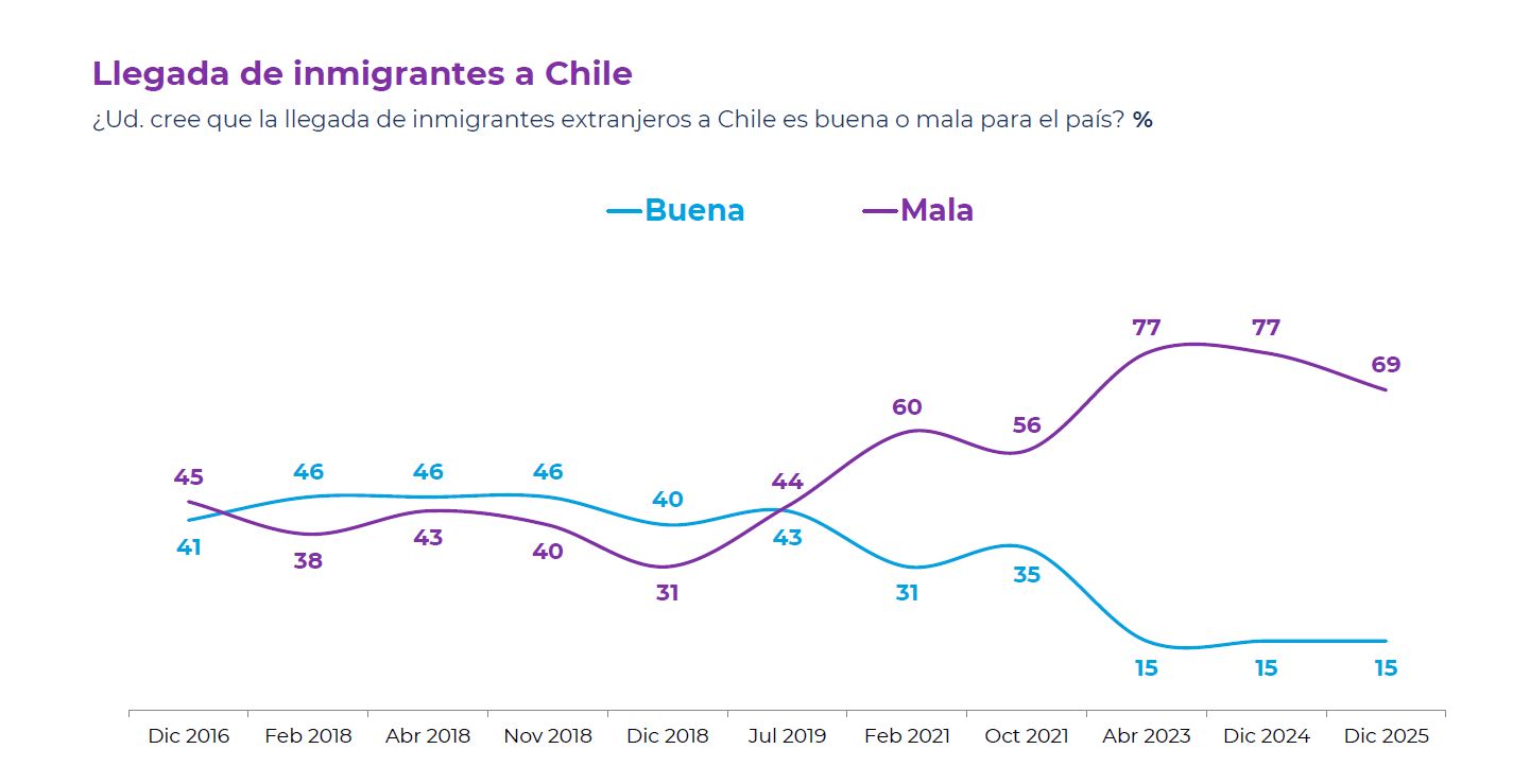 Ante la consulta, "¿ud. Cree que la llegada de inmigrantes extranjeros a Chile es buena o mala para el país", un 69% de los encuestados dijo que era "mala", mientras que un 15% señaló que "buena".
