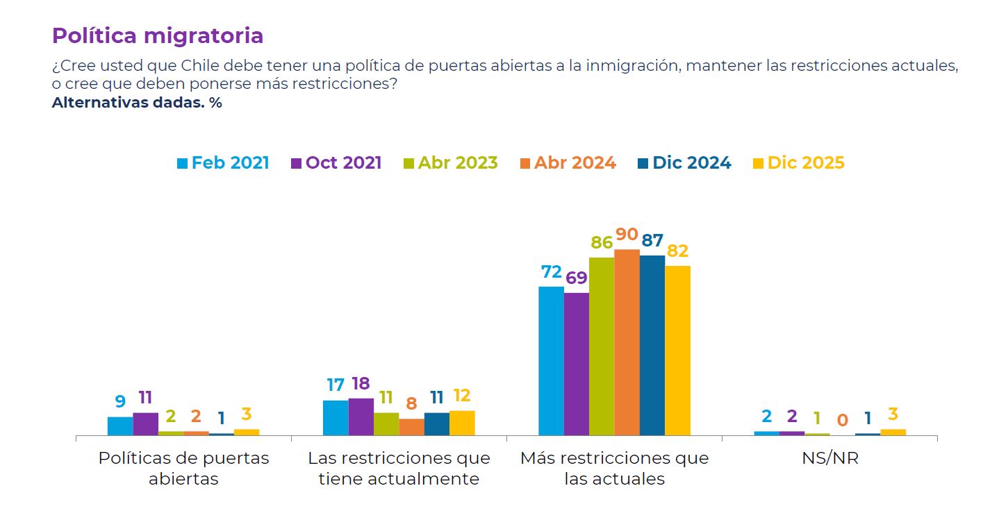 Considerando solo los datos de diciembre de 2025, un 82% se inclinó por "más restricciones que las actuales", un 12% por "las restricciones que tiene actualmente", un 3% por "políticas de puertas abiertas" y otro 3% se inclinó por la opción "no sabe/no responde".
